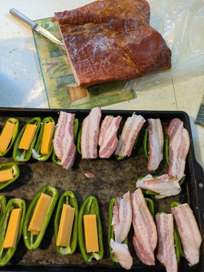 One of the favorite meals is jalapeno poppers. Not so healthy. Big, thick walled, juicy crisp, not so spicy peppers, filled with cheese, then wrapped in bacon. We have some slabs of bacon, not cut, just a big hearty slab, saved just for this delicacy from a small butcher shop/smoker down in Colorado. Nothing but the best for our favorite, very unhealthy meal.