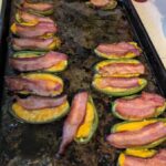 I had a package of bacon in the fridge, thawed and ready to slice. I picked the biggest, juiciest peppers. But, as I started to cut the bacon I ran into problems. This bacon sure was cutting hard. I could barely get a knife through it. It looked a bit odd too. Finally managing to saw enough off to finish the meal I put the whole thing in the oven.
