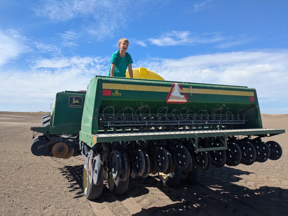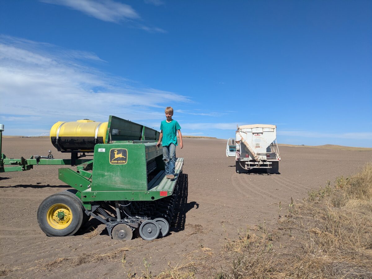 We made quite the convoy heading off down the gravel road. I got to take the lead in the old truck with a seed tender on back. My husband followed in the tractor and drill. Kids brought up the rear in the pickup.